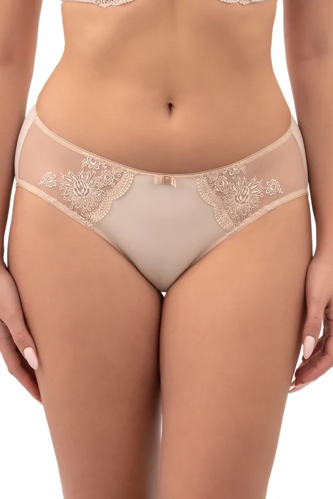 Трусы слип со средней линией талии. Передняя деталь украшена ажурной вышивкой. Ластовица из хлопкового трикотажного полотна. Декор – атласный бант.