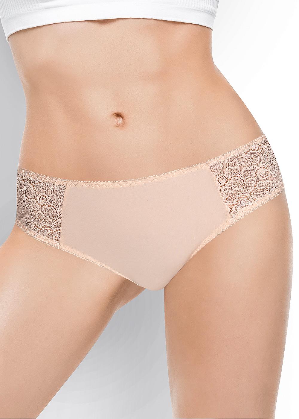 Трусы-слипы женские из эластичного хлопкового полотна. По спинке и переду вставки из кружева. Обработка краев - ажурная резинка с фестоном.
