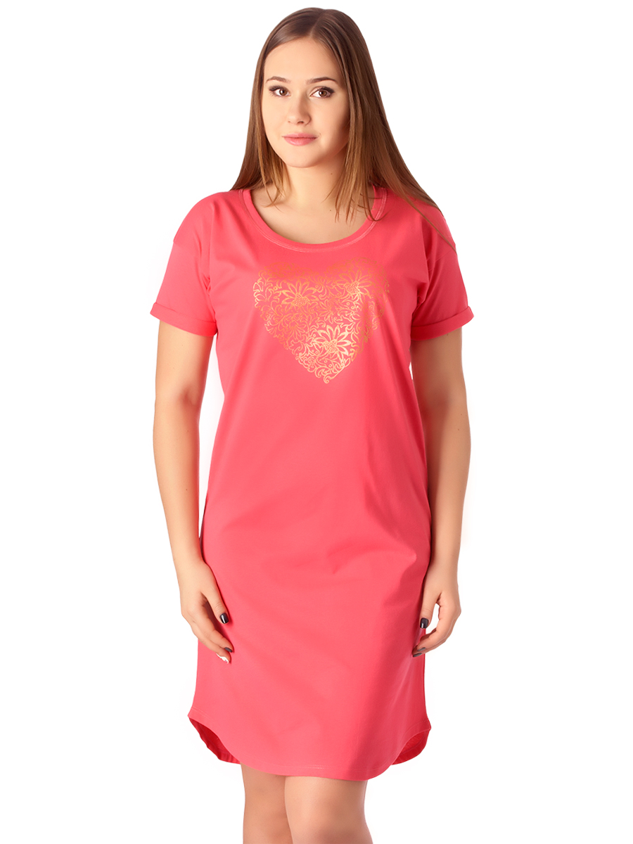 Кокетливая сорочка-туника из хлопка для сна и отдыха. Выполнена в форме удлиненной футболки, слегка приталенного силуэта, с коротким рукавом, круглым вырезом горловины и фигурной линией низа. Для комфорта спинка длиннее полочки на 10 см. На полочке декор в форме ажурного сердечка, тиснением золотой фольгой.