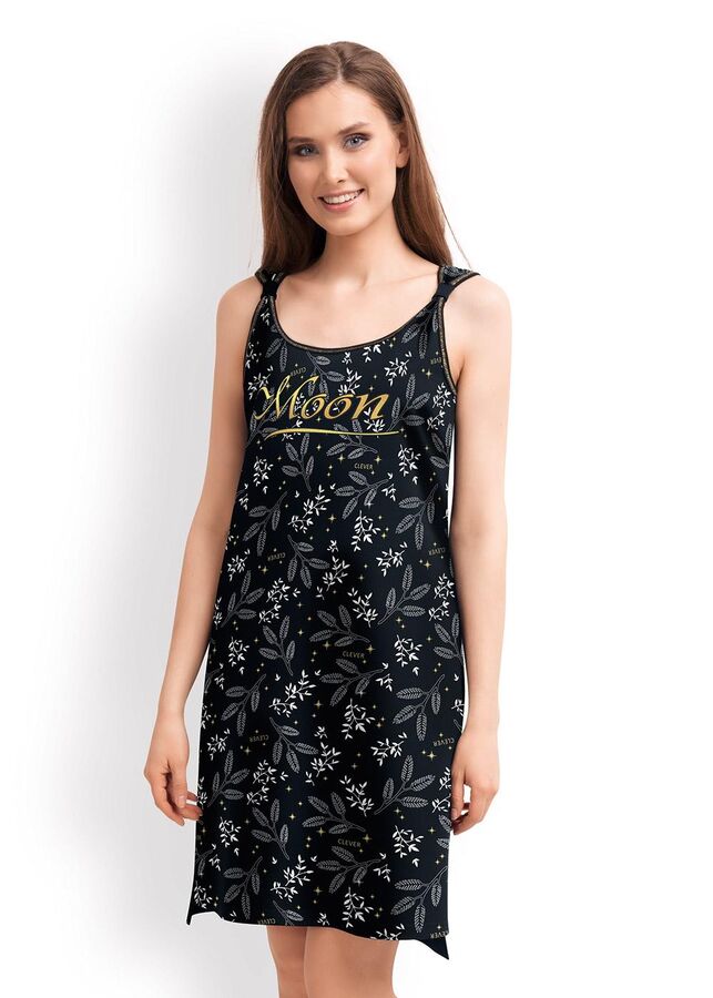 Сорочка из набивной кулирки. Модель с широкой бретелью с добавлением регулируемой перемычки, низ ассиметричный. Спереди принт фольгой. Перевод с анг.: "Луна".