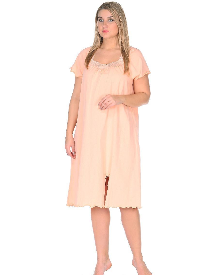 Комфортная сорочка длиной до колена из однотонного хлопкового трикотажа, свободной формы, с легкой сборкой по горловине, линия декольте оформлена кружевной кокеткой. Рукав короткий, покроя реглан; разрез на левой ножке украшен бантиком.