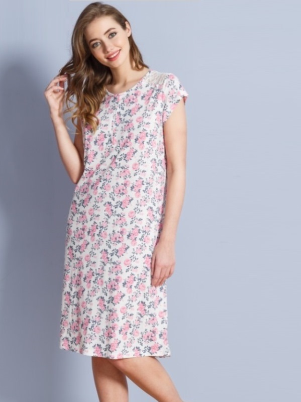 Женская сорочка с цветочным принтом длиной ниже линии колен, свободной формы, с коротким рукавов, вырез горловины декорирован планкой с пуговицами. Выполнена из качественного вискозного материала. Отличный вариант для сна на каждый день.