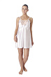Женская короткая сорочка из шелка, полуприлегающего силуэта, расширенная книзу, на тонких регулируемых бретелях, вырез декольте и низ изделия декорированы узкой кружевной лентой, на левой ножке расположена декоративная вставка из кружевного полотна, верх украшен розочками из атласной ленты.