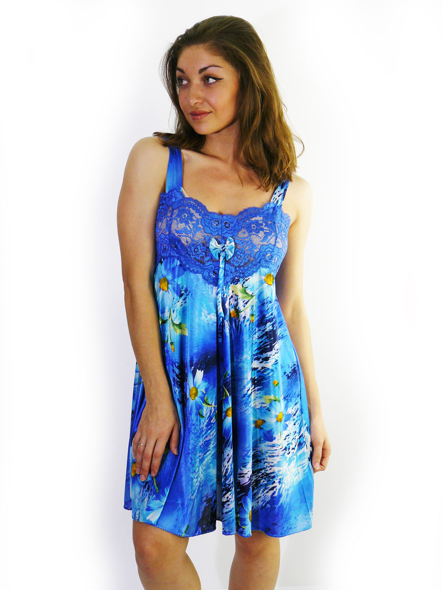 Нарядная короткая сорочка выполнена из цветного шёлкового трикотажа, полуприлегающего силуэта, расширенная книзу, на широких бретелях, лиф сорочки из эластичного кружева. Декорирована бантиком на груди.