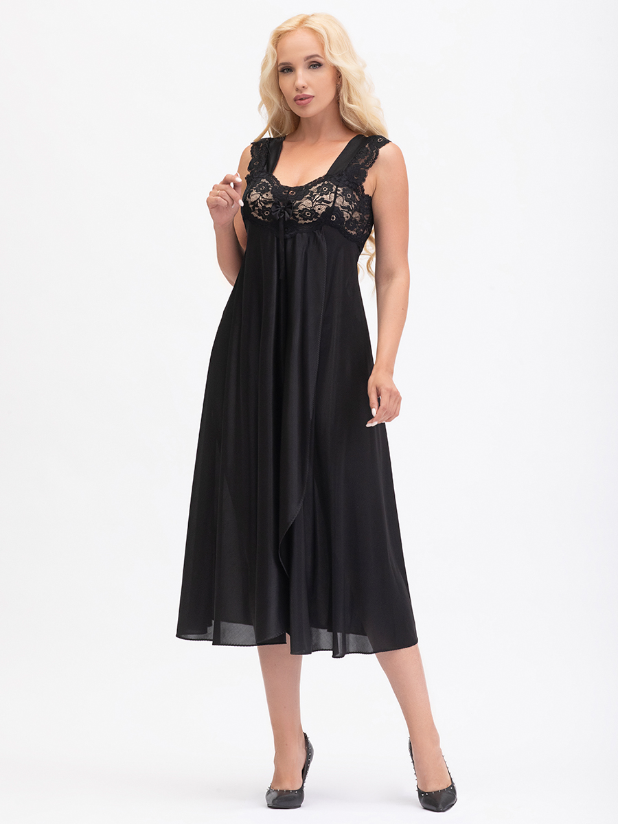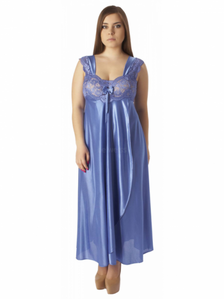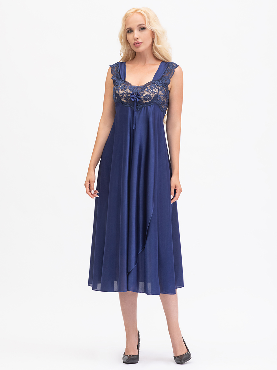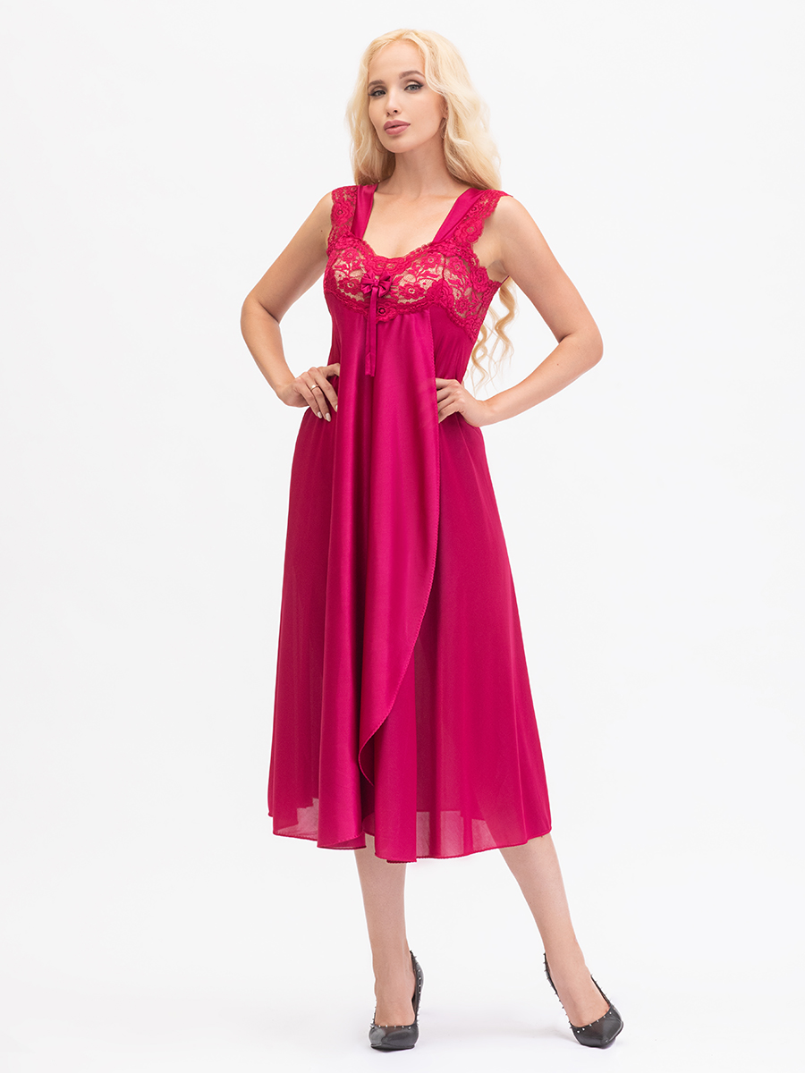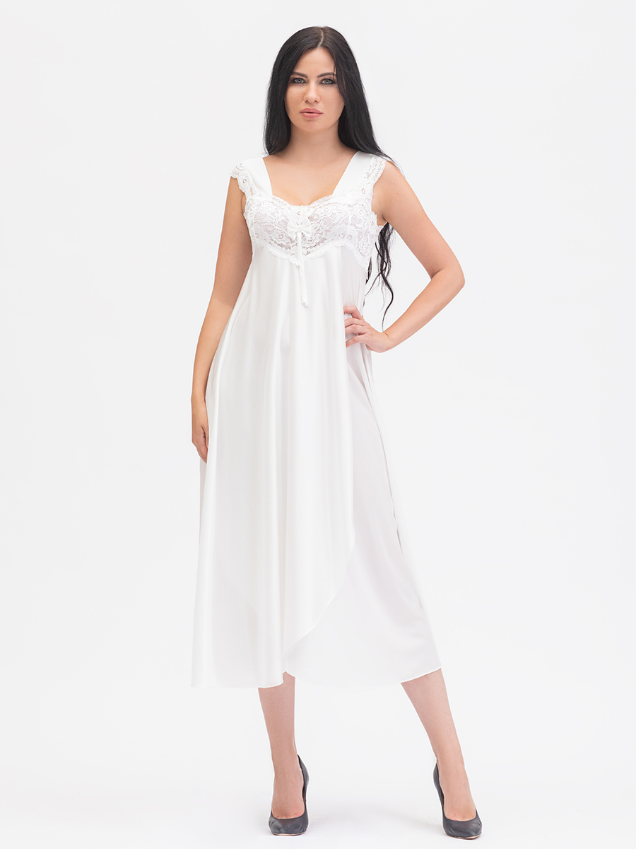 Нарядная длинная сорочка выполнена из однотонного шёлкового трикотажа, полуприлегающего силуэта, расширенная книзу, с передней деталью "на запах"; широкие бретели, украшены кружевом, лиф сорочки из эластичного кружева. Декорирована бантиком на груди.