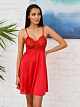 Нарядная сорочка выполнена из однотонного шёлкового трикотажа, полуприлегающего силуэта, расклешенная книзу, на тонких бретелях, лиф сорочки из эластичного кружева. Чашечки лифа обеспечивают комфорт для груди. Длина сорочки чуть выше линии колена.
