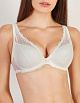 Кружевной бюстгальтер бралетт с дышащими чашками «спейсер» из коллекции №299 нежного молочного оттенка. На каркасах. Чашка формованная, полая, выполнена из 3D spacer-полотна, гибкая, немнущаяся, с внутренней боковой корректирующей деталью из капрона для лучшей поддержки. Внешняя сторона чашки из сшивного эластичного кружевного полотна с вертикальным членением, плавно переходящего в широкие кружевные бретели, регулируемые по длине сзади. Верхние кружевные срезы чашек укреплены тонкой эластичной лентой, что предотвращает деформацию при ношении. Линия соединения деталей стана занижена. Пояс выполнен из эластичного кружевного полотна.