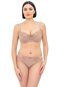 Бюстгальтер c формованными чашками “Spacer” на стане, на каркасах. Стан из вышивки на сетке .Передняя и боковые детали стана укреплены монокапроном, в боковых швах - упругие пластины. Бретели «anti-slip» спереди украшены атласными бантиками. Декор – атласные банты.