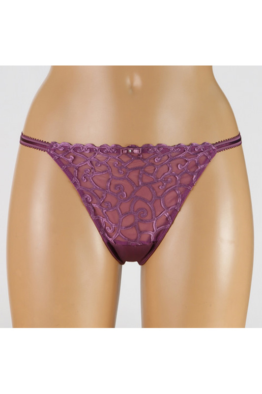 Трусики-танга сшиты из эластичного гладкого полотна. Передняя деталь выполнена из сетчатой ткани и украшена вышивкой. Вышитая аппликация обработана лазером. По линии талии проходит эластичная тесьма, которая одновременно служит боковыми деталями.