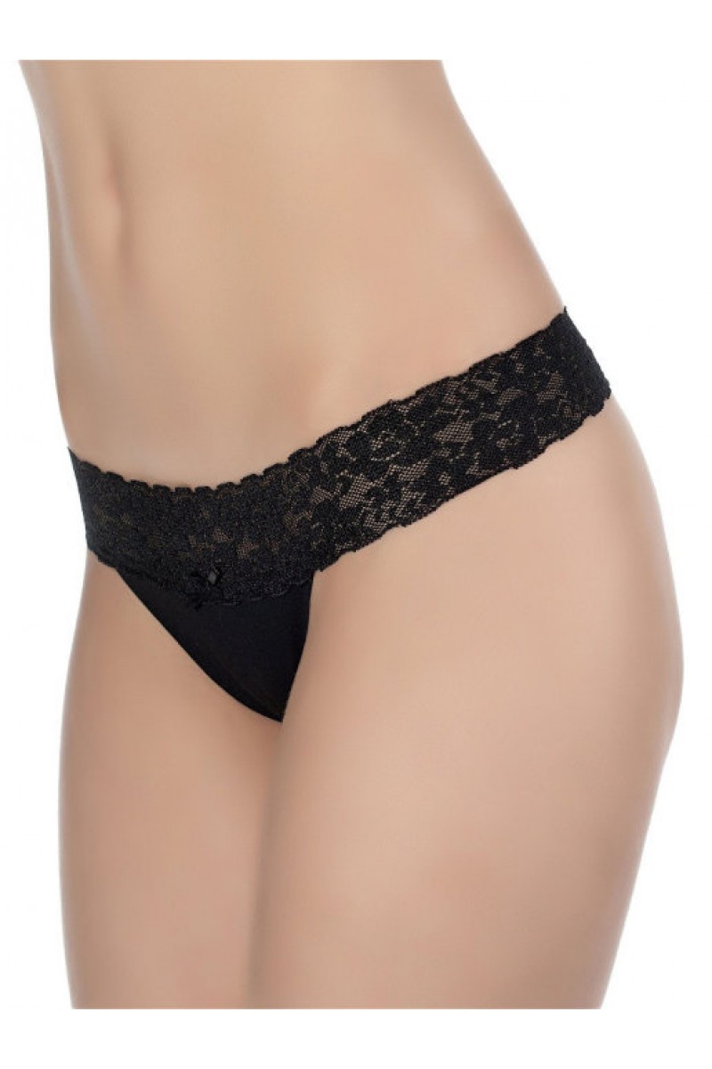 Стринги из хлопка с эластаном, на поясе широкая кружевная резинка с фронтальной аппликацией в виде банта, заниженная талия, лазерная обработка края.