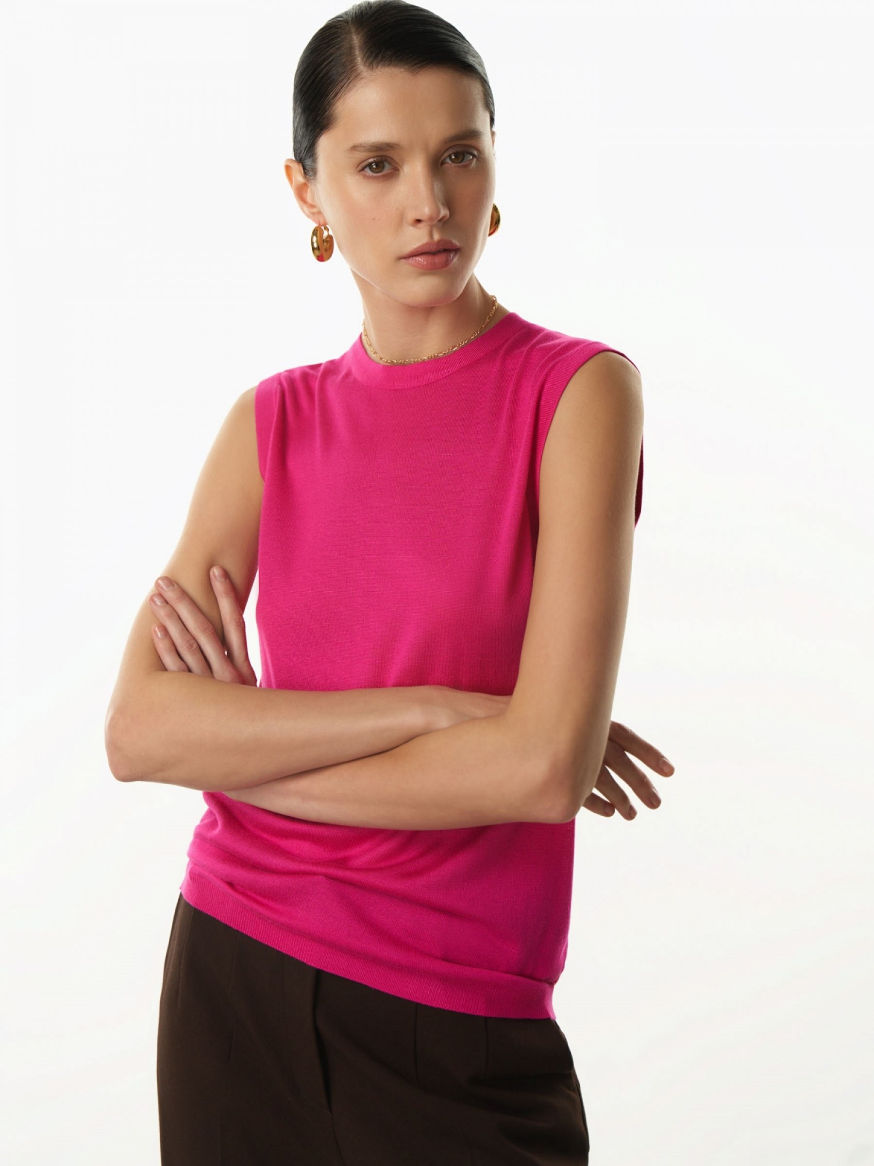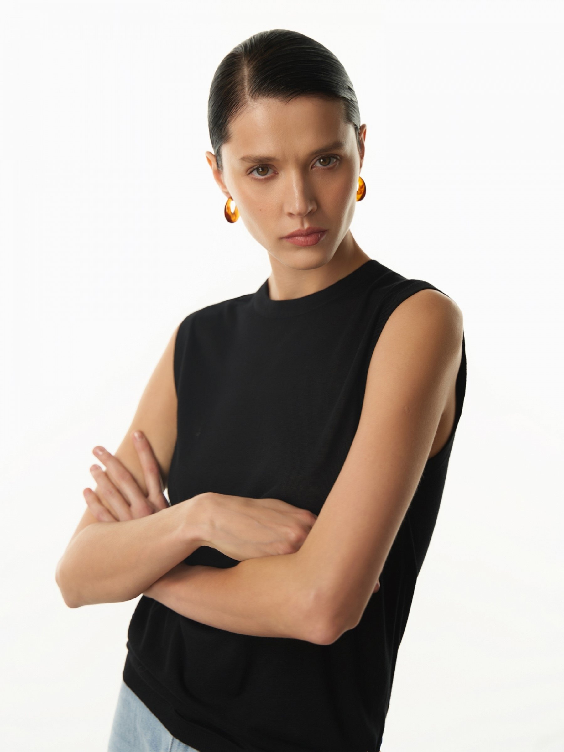 Топ классической длины полуприлегающего силуэта – расслабленный и лаконичный. Выполнен из легкого трикотажа на основе 100% вискозы. Круглая горловина и проймы декорированы гладкой резинкой в тон. Низ – фактурной резинкой также в тон. Модель выполнена в базовых и акцентных цветах, выбирайте под лук и настроение.