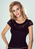 Элегантная блузка с круглым воротом и рукавами 3/4, манжеты присборены и декорированы контрастным кружевом, на груди разрез с кружевными краями и завязками, внутри имитация майки из микросеточки.