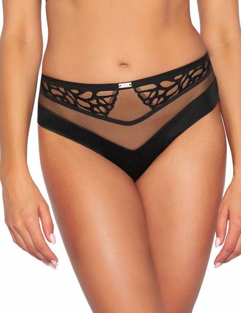 Трусики слип выполнены в черном цвете из эластичного трикотажа, продублированного сеткой и сетки с вышивкой черной нитью, спинка из трикотажа и сетки, сложенной вдвое. Ластовица проложена 100% хлопком.