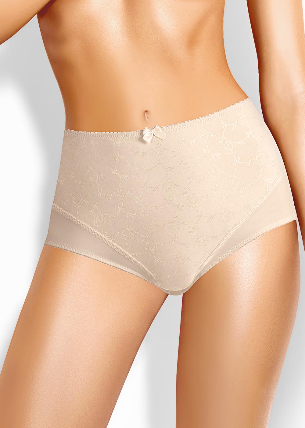 Трусы-макси утяжка женские из полиамида. Обработка краев - ажурная резинка с фестоном. Перед дублируется вставкой из эластичного жаккардового полотна. По переду бант.