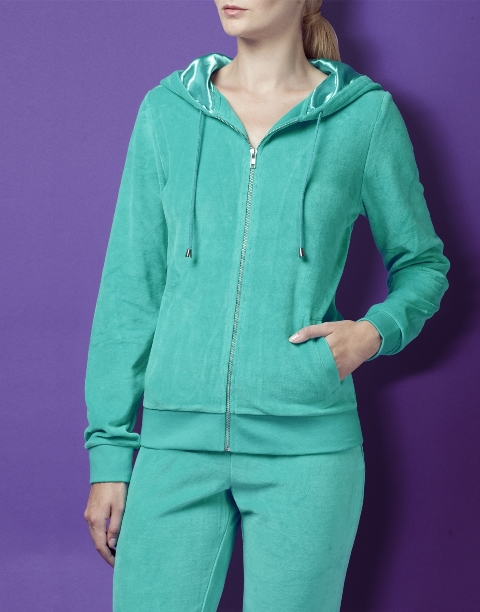 Плюшевый жакет с капюшоном на атласной подкладке и регулировкой объема завязками.Модель с застежкой на молнию, двумя прорезными карманами, резинками на манжетах и по низу изделия.