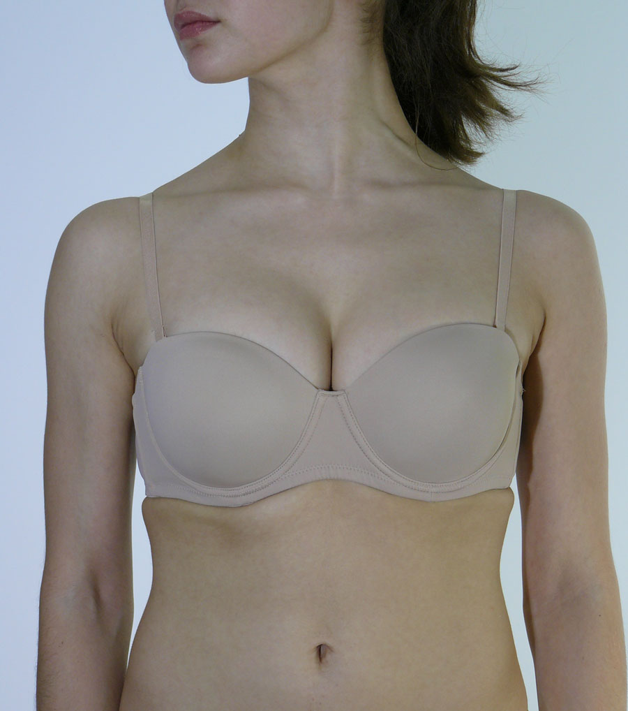 Бюстгальтер "фашия" с формованной чашкой с лепестковым вкладышем. По нижнему краю - силиконовая полоса. Дополнительные прозрачные съемные бретели.