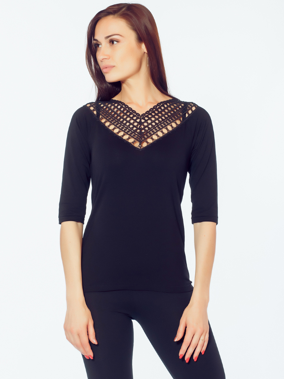 Элегантная блузка с рукавами 3/4 и V-образным воротом. Зона декольте модели декорирована объемной гипюровой вставкой.
