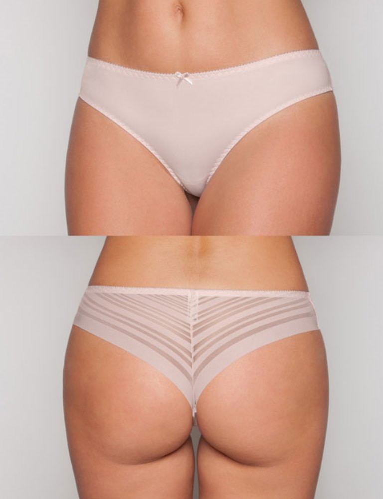 Передняя деталь выполнена из эластичного полотна с микрофиброй, задняя из ультратонкой эластичной сеточки с стильным узором полоска. Верхний срез обработан эластичной тесьмой; срезы пройм обработаны на плоскошовной машине, не выделяются под одеждой. Ластовица из хлопка.