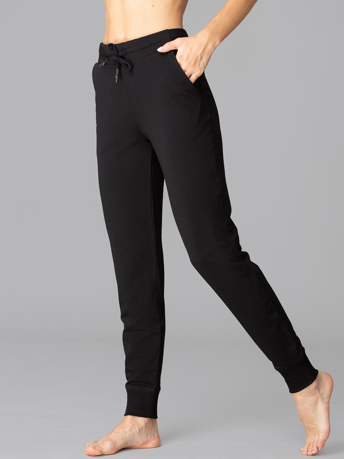 Свободные джоггеры с кокеткой, манжетами снизу и двумя карманами на фронтальной части. Главное их преимущество — это спортивный трикотажный футер, из которого они сшиты. Он отличается повышенной износостойкостью, несминаемостью и устойчивостью к деформации благодаря тому, что связан в два слоя: верхний — из хлопка с эластаном, нижний — из полиэстера.