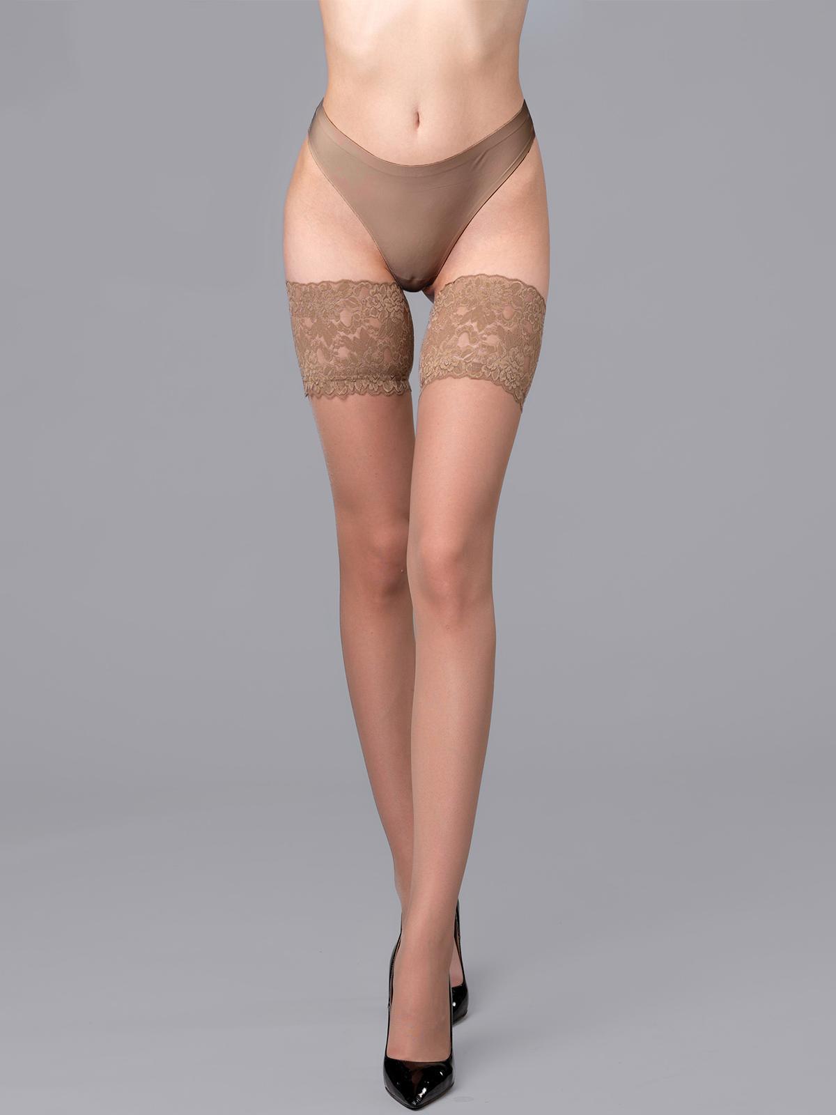 Прозрачные шелковистые чулки плотностью 40 ден, с красивой кружевной резинкой шириной 14,5 см с двумя силиконовыми лентами, благодаря которым изделие надежно фиксируется на необходимой высоте, не скатывается и не сползает с ноги. Мысок модели усилен невидимым уплотнением. Самоудерживающиеся чулки очень практичны и не требуют дополнительных аксессуаров для создания эффектного и сексуального образа. Элегантное кружево декорировано объемным цветочным узором. Чулки прекрасно облегают ножки, формируя ровную поверхность.