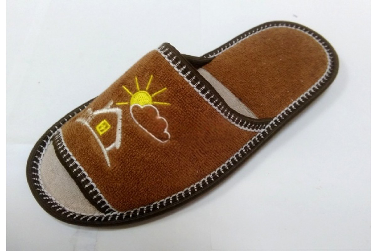 материал верха тапочка - махра (хлопок), цвет - коричневый, подкладка - махра (хлопок), вышивка "Домик"