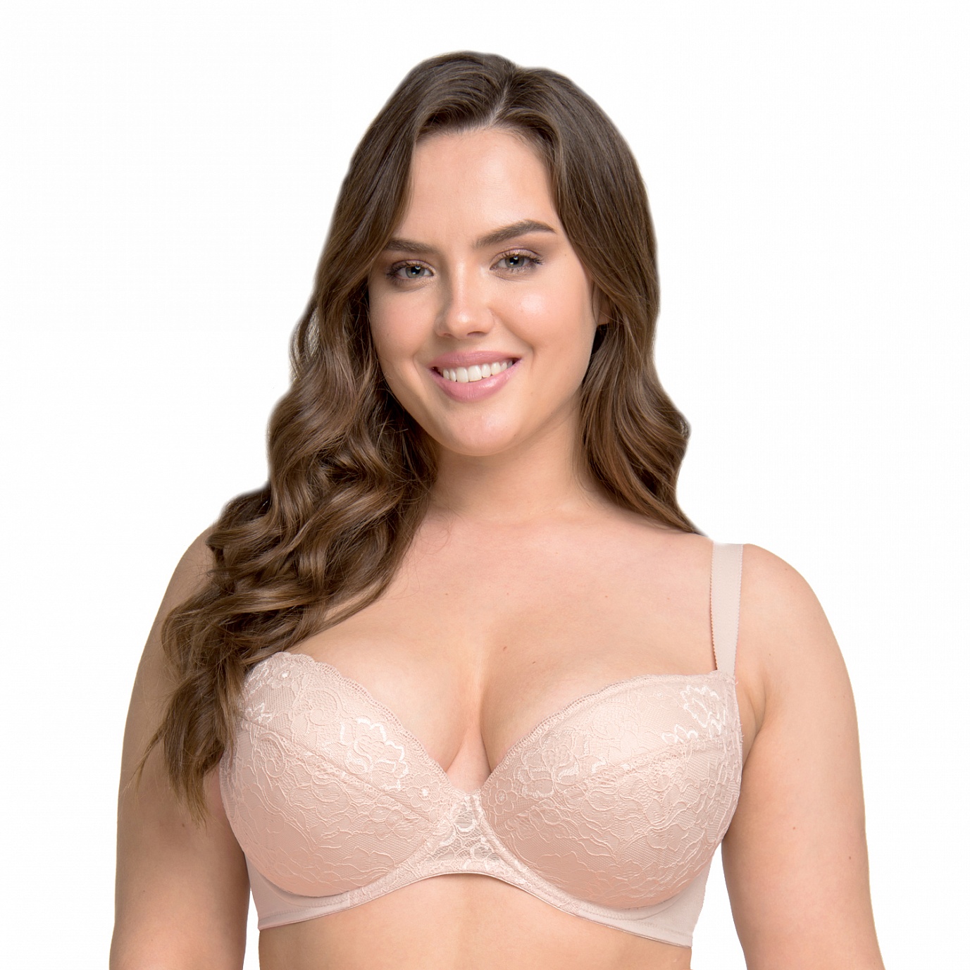 Бюстгальтер с поролоновой чашкой с эффектом push-up и с дополнительными поролоновыми вкладышами. Имеет широкую размерную шкалу до полноты F. Модель собирает грудь к центру, за счет низкой центральной детали и дополнительных вкладышей.
