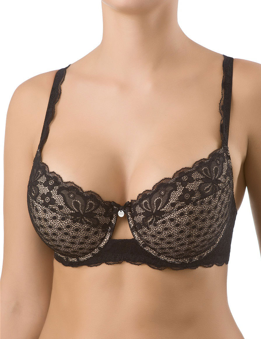 Бюстгальтер балконет с эффектом пуш-ап из классической коллекции ВИШ. На каркасах. Чашка сшивная, с тройным диагональным членением, продублирована по всему объему тонким слоем современного наполнителя бежевого цвета, с внутренними кармашками для съемных поролоновых вкладышей. Внешняя сторона покрыта мягким эластичным кружевом двух видов. Линия соединения деталей стана умеренно заниженная. Пояс выполнен из эластичного кружевного полотна. Бретели несъемные, декорированные кружевом спереди, регулируемые сзади.