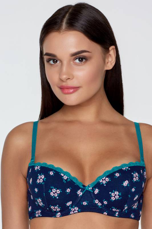 Бюстгальтер с формованной чашкой, без Push-up для всех размеров. Детали выполнены из эластичного, набивного полотна, эластичной сетки и кружева. Центральная деталь декорирована бантиком. Бретели съемные, регулируемые по длине.