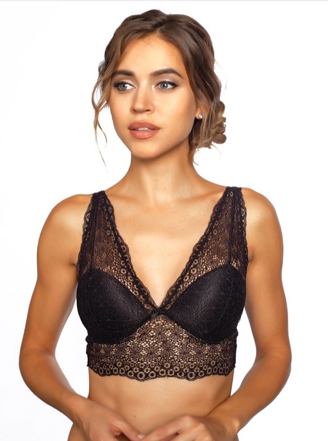 КБюстгальтер - бралетт с треугольными чашками без косточек и с кружевной отделкой под грудью. Выполнен из мягкого, эластичного кружева. Боковые части бюстгальтера обработаны мягкой резинкой с фестонами. Бретели гладкие, регулируемые по длине. Перемычка бюстгальтера украшена атласным бантом. Идеальная поддержка для любой груди.