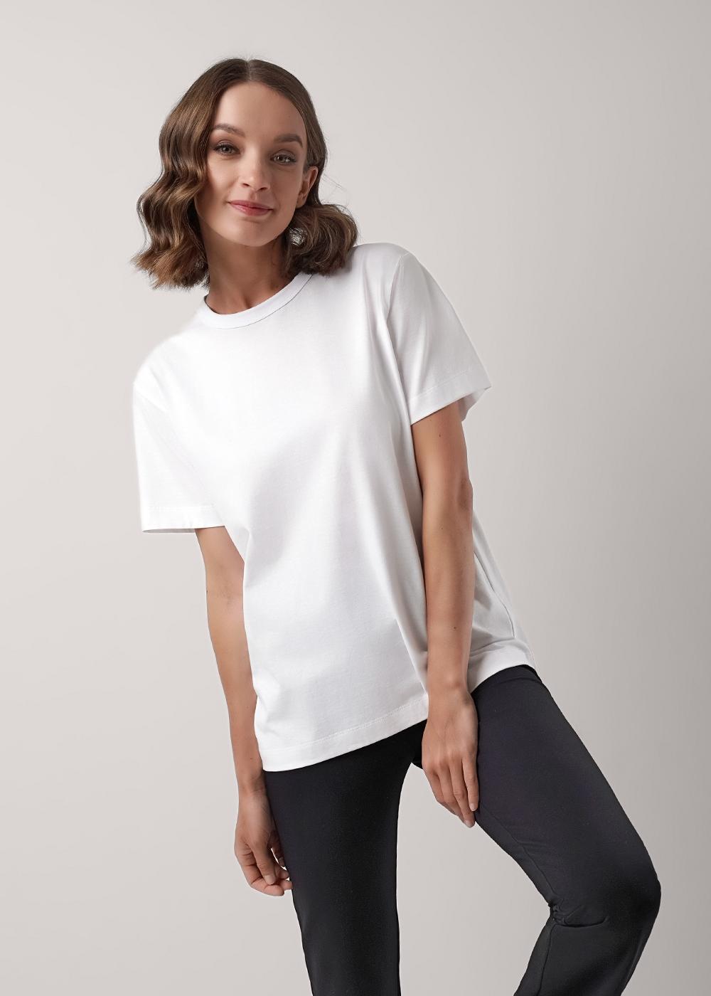 Футболка умеренного объема из хлопкового трикотажного полотна. Втачной короткий рукав. Округлая горловина с окантовкой.