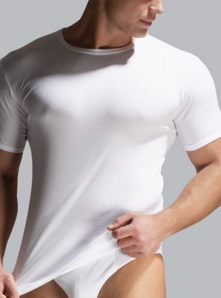 Классическая мужская бельевая футболка из мягкого хлопкового волокна с коротким рукавом и круглым вырезом под горло.