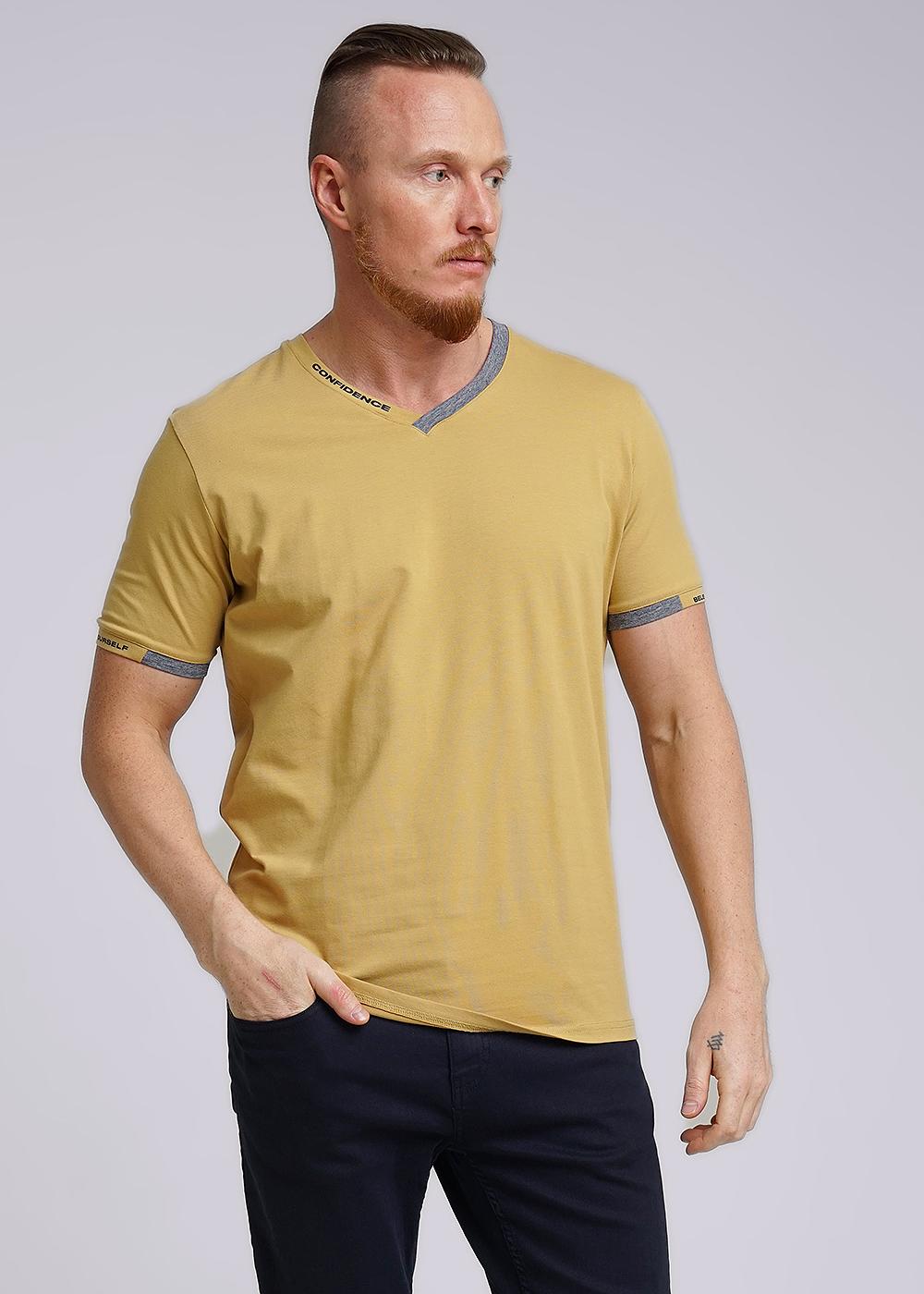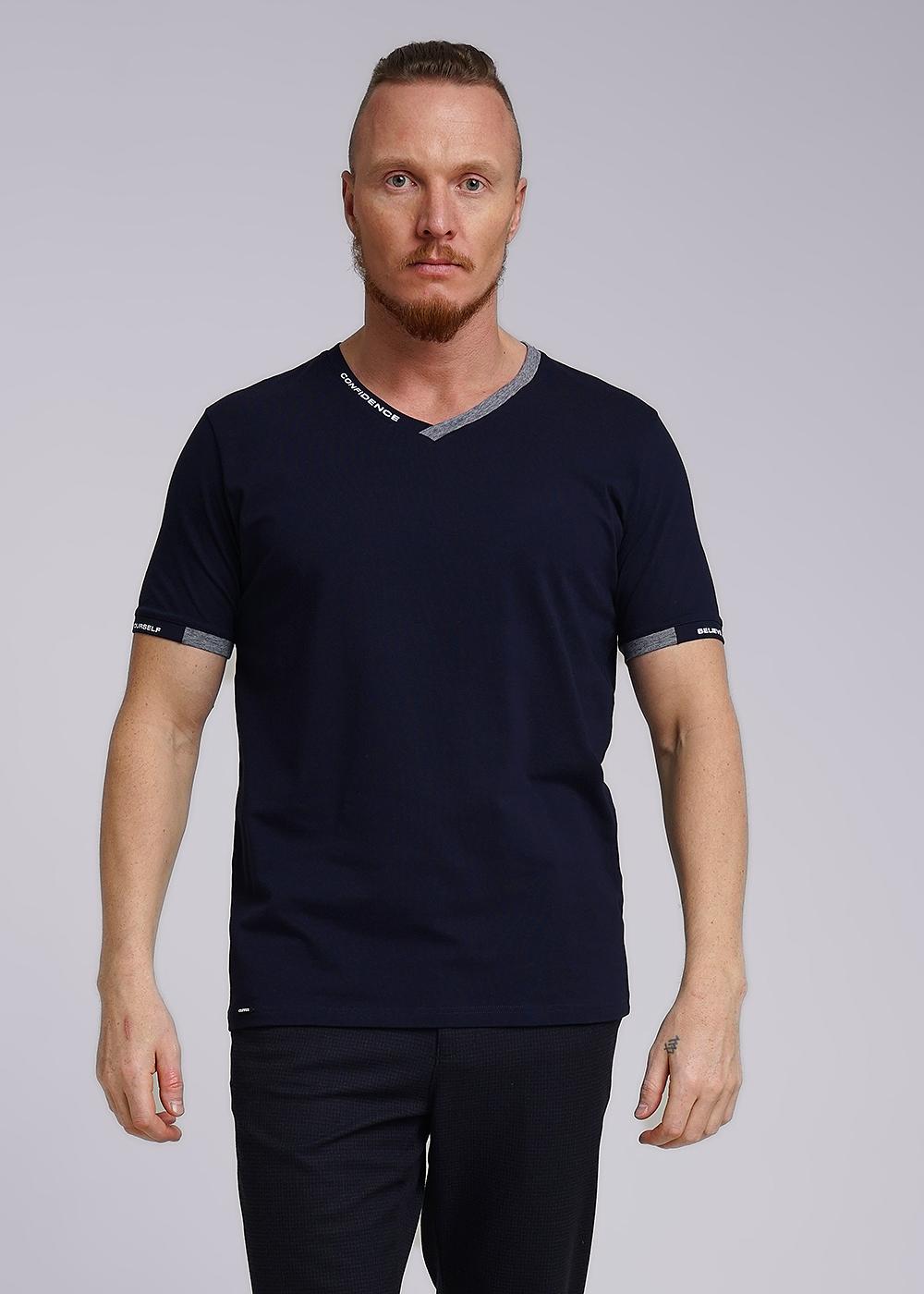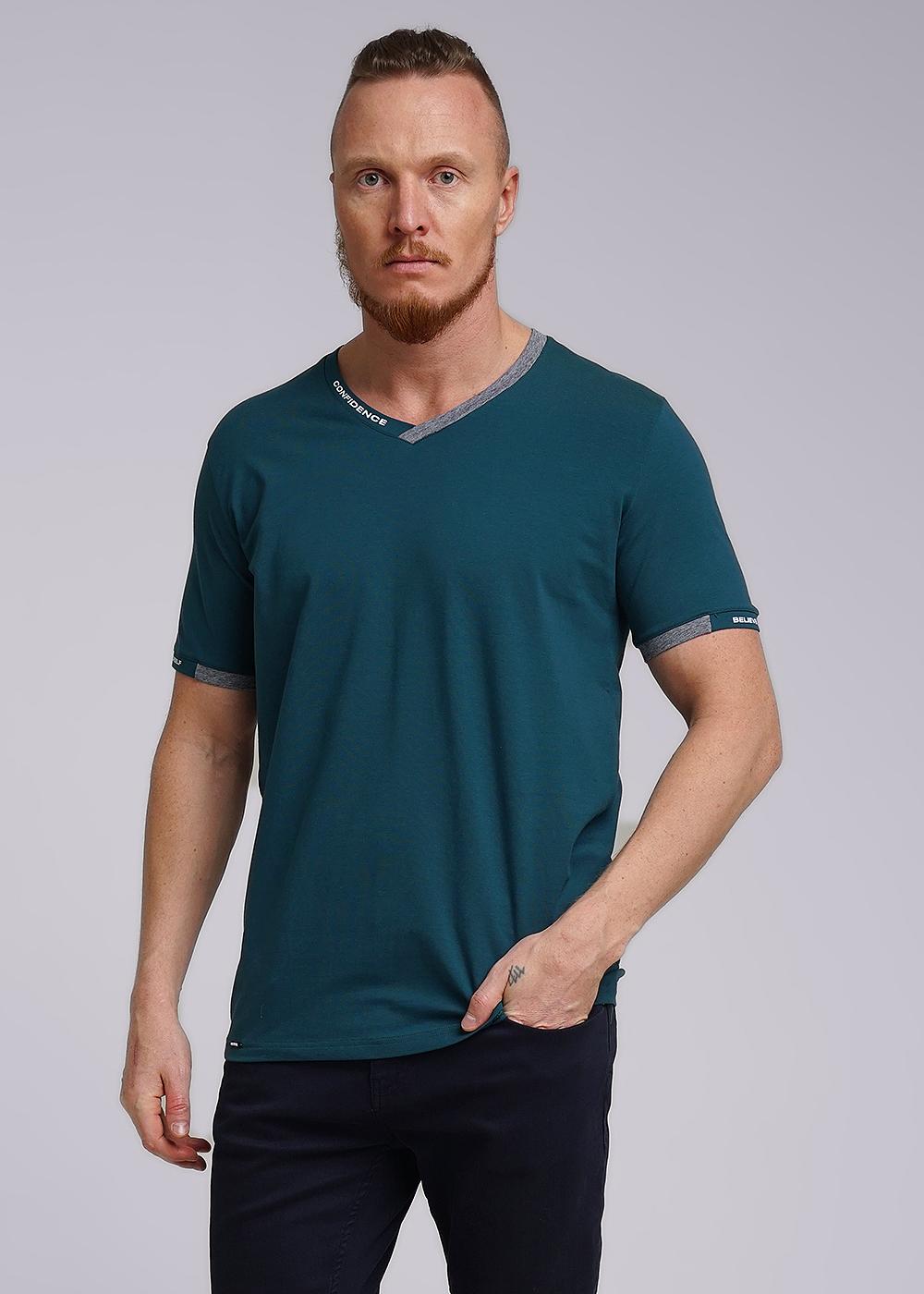 Футболка мужская из дышащего хлопкового полотна. Модель с V-образным вырезом горловины, коротким втачным рукавом. Прекрасно сочетается с джинсами или шортами. Модель дополнена принтом и имиджевой нашивкой.