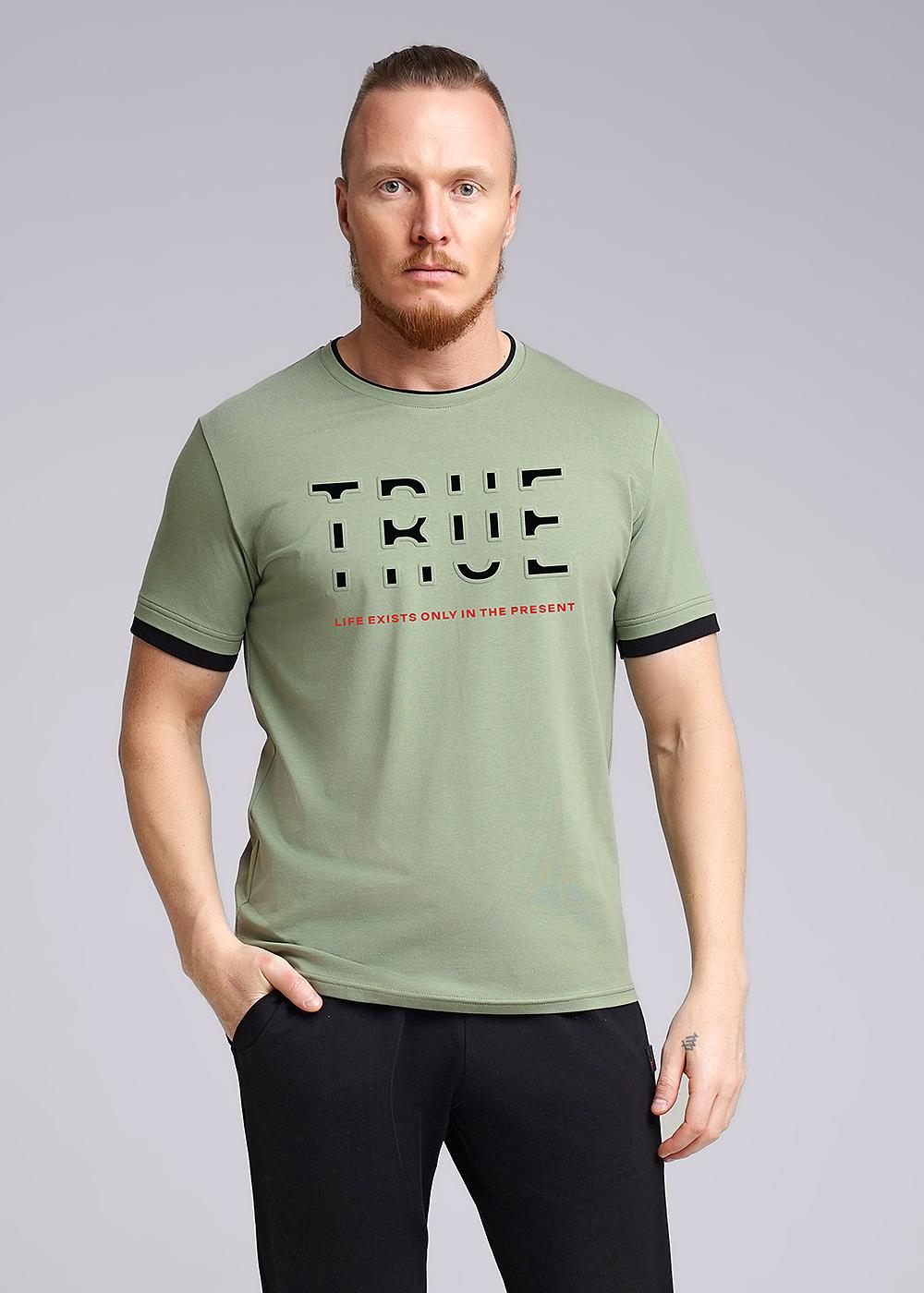 Футболка из трикотажного полотна с круглой горловиной и коротким рукавом. По горловине и низу рукавов конрастные отделки. Дополнена объемным принтом. Отличный вариант для встреч с друзьями и поргулок.