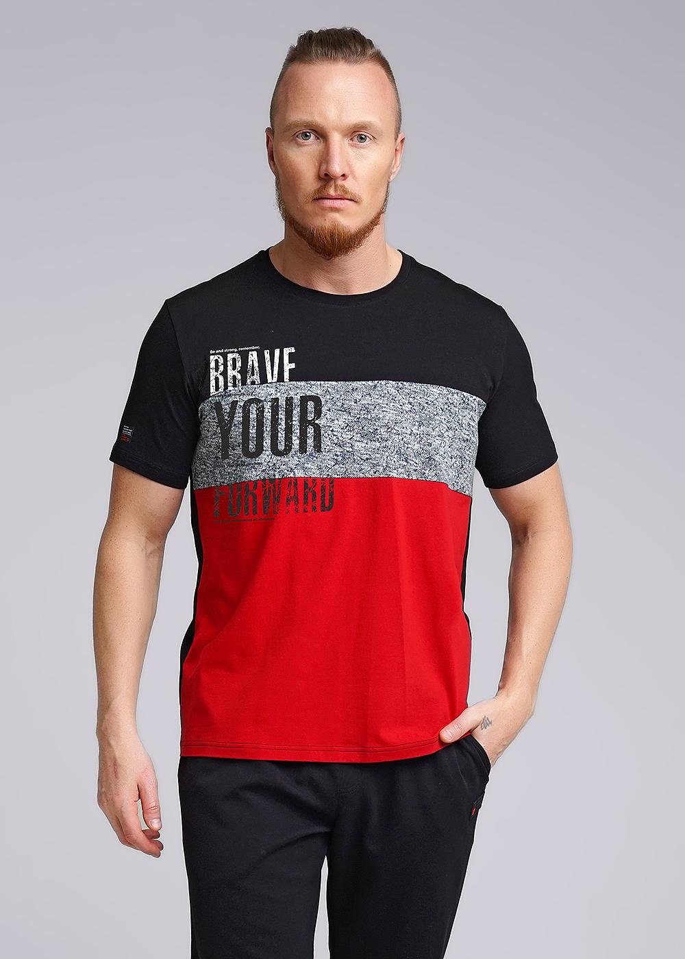Футболка комбинированная с вставкой на полочке и оригинальным принтом. С коротким рукавом и круглой горловиной. Дополнена имиджевой фурнитурой. Отличный вариант для встреч с друзьями .