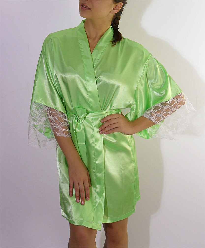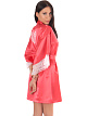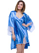 Короткий кокетливый халатик покроя "кимоно" из однотонного искусственного шелка, с запахом под пояс. Рукава широкие, длиной три четверти, с удлинённой проймой, по низу отделаны изысканным ажурным кружевом с фестонами. На спинке выполнена декоративная вставка в форме сердечка из ажурного кружева.