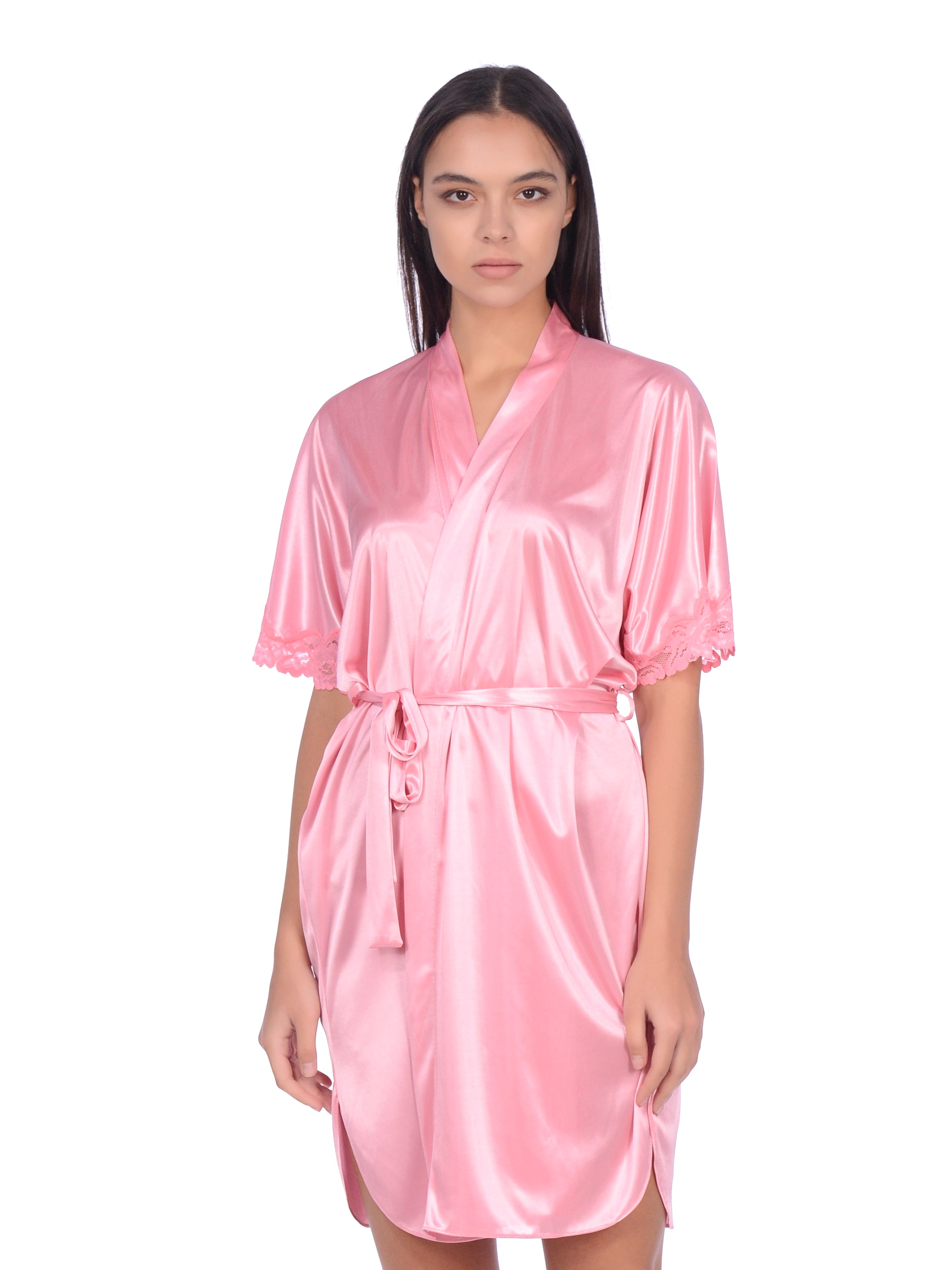Короткий халатик из шелковистого трикотажного однотонного полотна; прямого силуэта, свободного покроя, с запахом под пояс. Цельнокроенный короткий рукав по низу декорирован фигурным эластичным кружевом в тон. По бокам закруглённые разрезы.