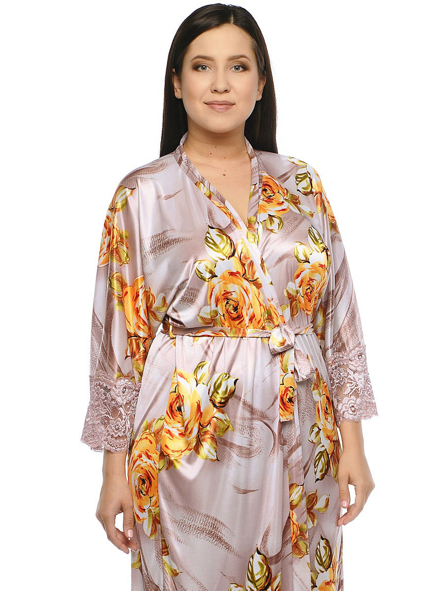 Роскошный длинный халат из шелковистого трикотажного цветного полотна; прямого силуэта, свободного покроя, с запахом под пояс. Цельнокроенный рукав длиной три четверти, по низу отделан широким эластичным кружевом в тон.