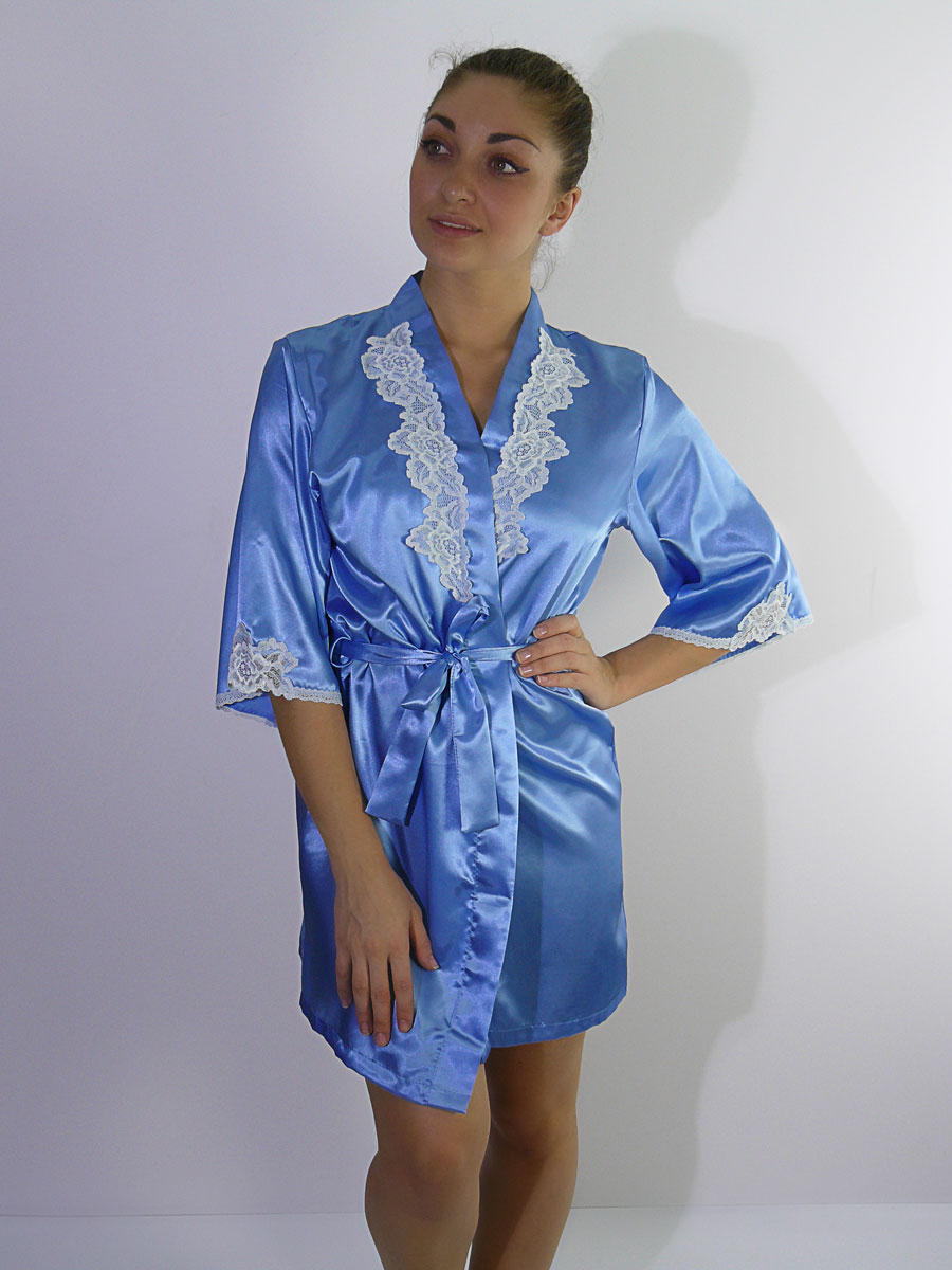 Короткий халат на запах, декорирован кружевом.