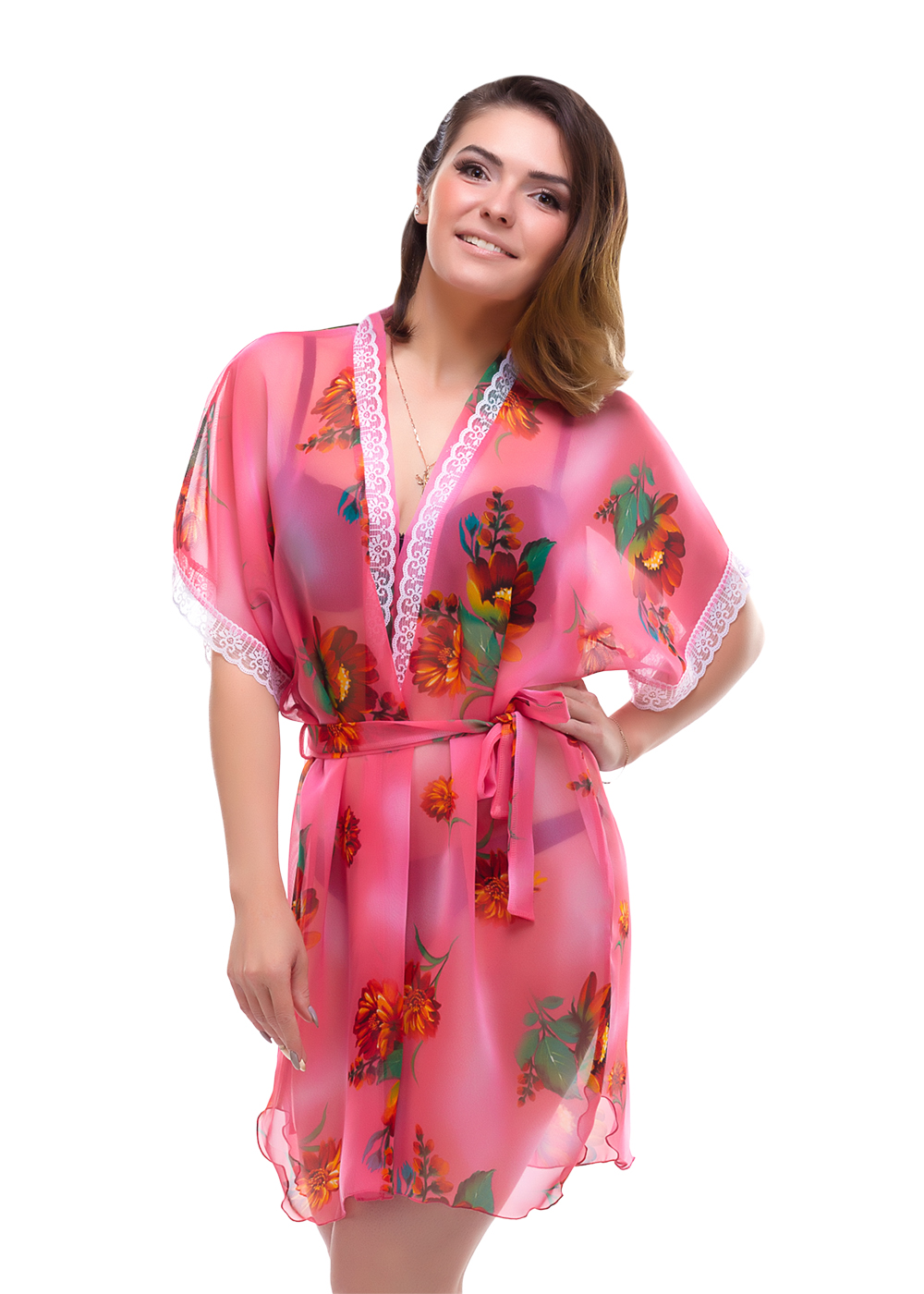 Легкий шифоновый халатик покроя "кимоно", с запахом под пояс, с планкой по борту. Короткий рукав и горловина украшены кружевом.