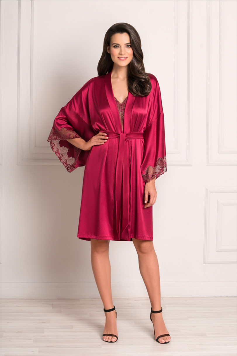 Халат женский c запахом, рукава кимоно отделаны кружевом.