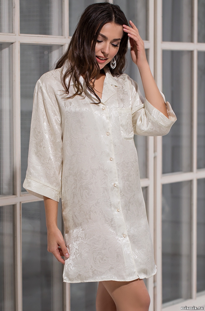 Рубашка Mia-Amore свободного покроя с рукавом длиной ¾, выполнена из натурального шелка с жаккардовой основой. По бокам расположены карманы и разрезы.