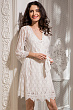 Короткий халат–кимоно выполнен из кружевного полотна. Низ и борта декорированы фигурным кружевом.