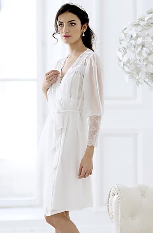 Короткий легкий запашной халатик с короткими рукавчиками из кружева. Халат богато декорирован кружевом на спинке и спереди. По бокам халат имеет кармашки и разрезы. Модель с широким поясом.