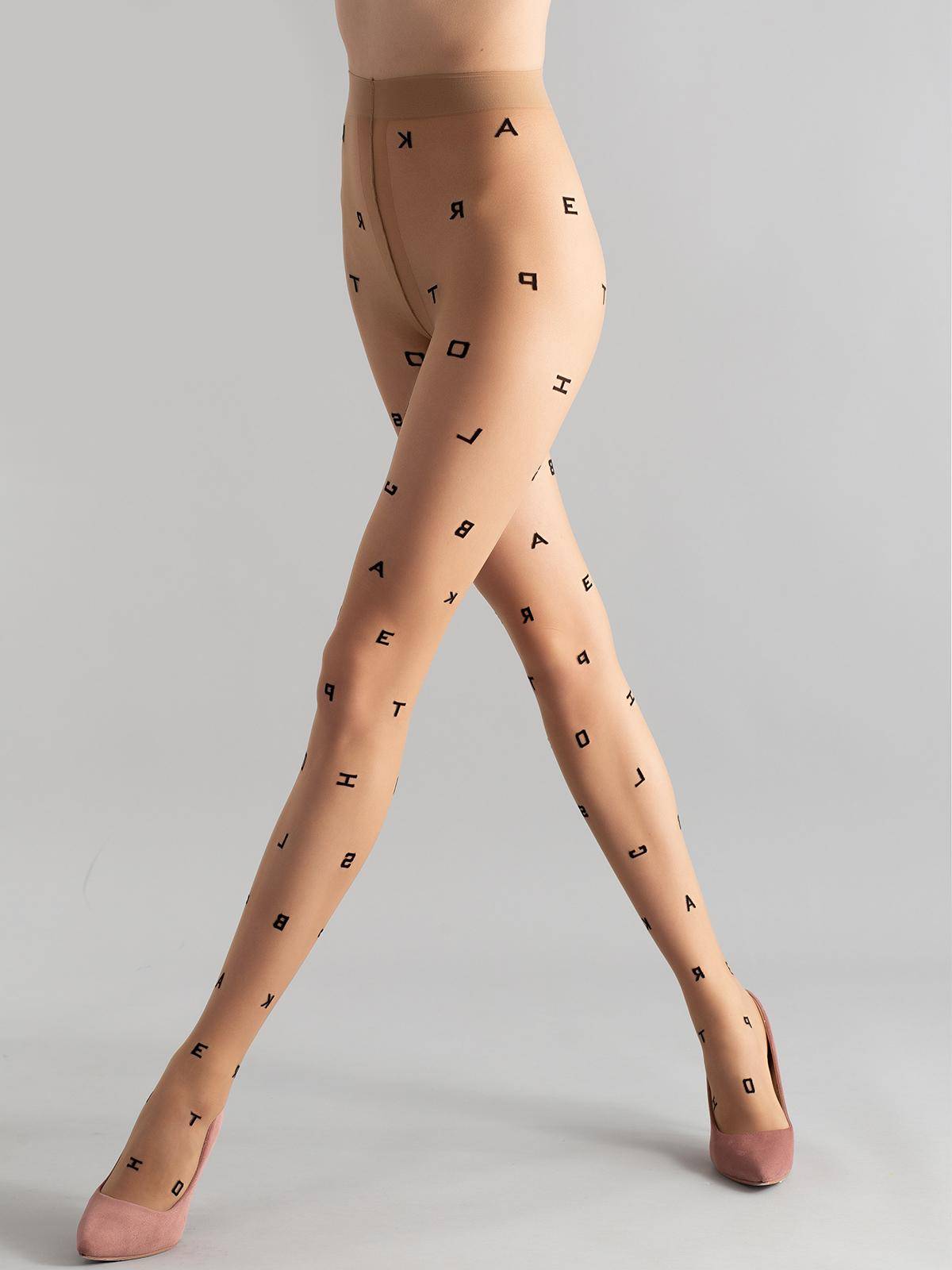 Тонкие фантазийные колготки с лайкрой, плотностью 20 ден, с широким комфортным поясом, гигиеничной ластовицей и усиленными плоскими швами. По всей длине колготок рисунок в виде алфавита.