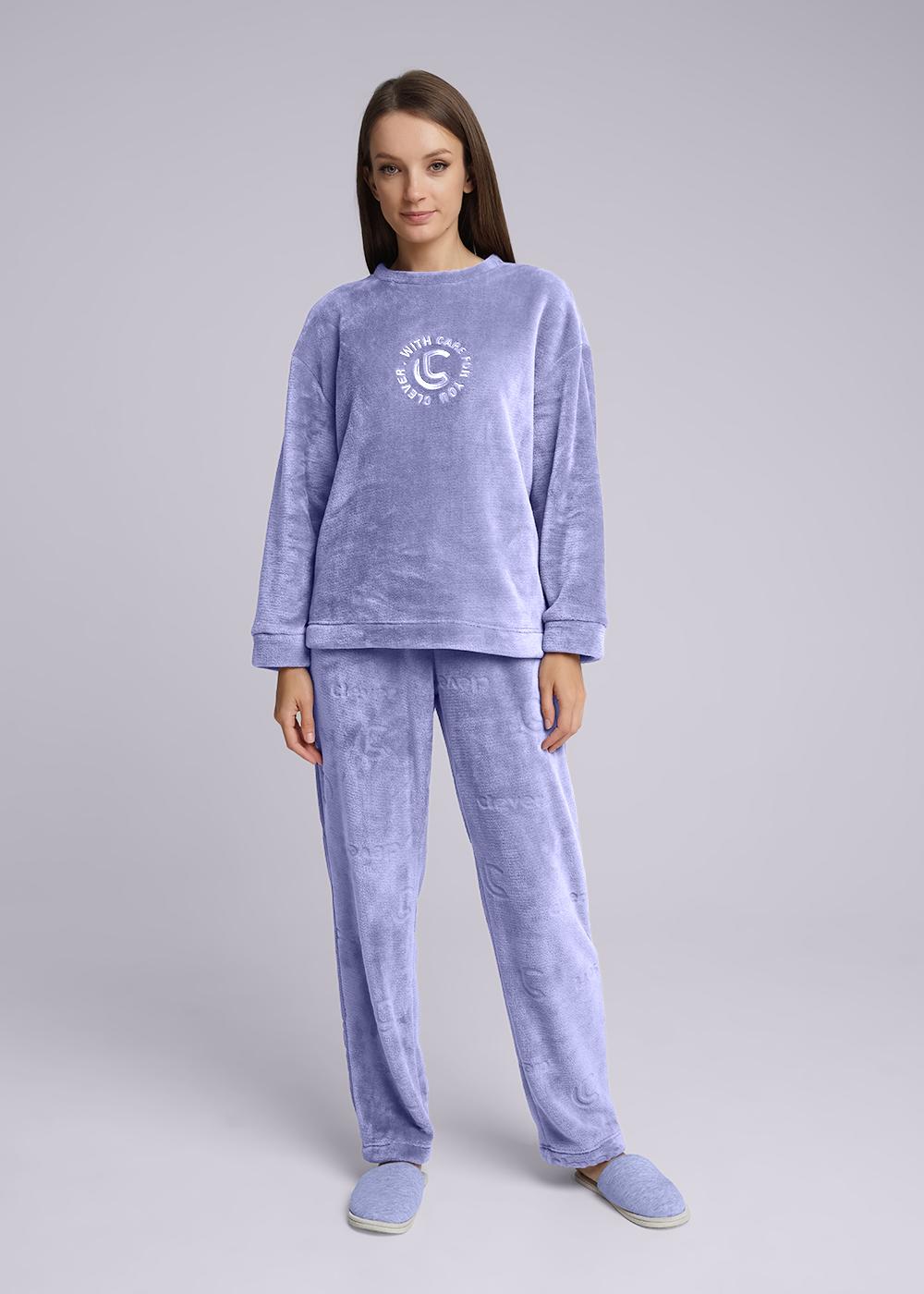 Уютный комплект из велсофта, состоящий из джемпера прямого кроя с длинным рукавом со спущенной линией плеча и брюк универсальной посадки. На полочке изделие дополнено вышивкой.