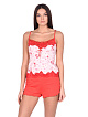 Комплект из нежного хлопкового трикотажа, состоит из майки и шорт. Майка цветная полуприлегающего силуэта с отрезной кокеткой на тонких бретелях, по низу и горловине фигурное кружево. Горловина с нежной рюшкой, линия под грудью подчеркнута атласной лентой и украшена бантиком. Шорты однотонные классические, линия низа прямая с фигурными закругленными разрезами, с бантиками.
