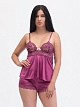 Кокетливый комплект из шёлкового трикотажа. Состоит из топа и шортиков. Топ полуприлегающего силуэта, слегка расширен книзу, на тонких бретелях, отрезной лиф полочки из эластичного кружева, спинка с фигурной кокеткой. Чашечки лифа обеспечивают комфорт для груди. Шорты короткие на резинке, по низу декорированы кружевом.
