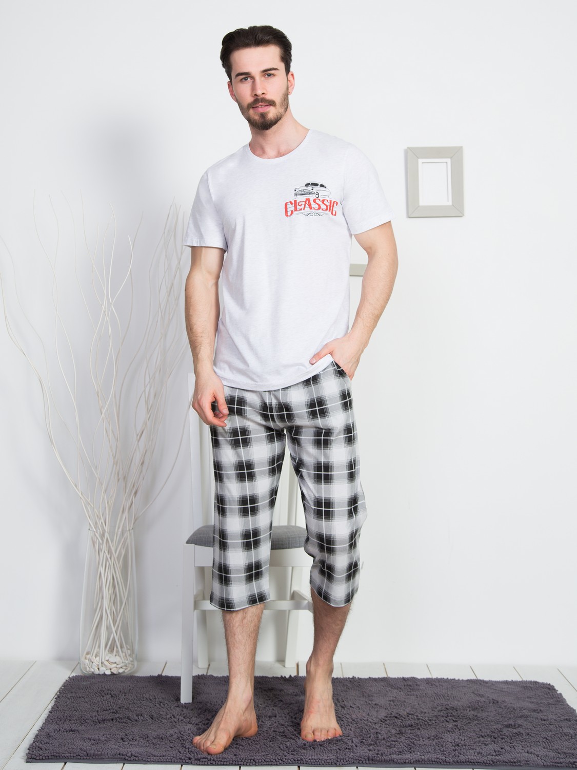 Домашний мужской комплект прямого свободного кроя из турецкого хлопка в светло-сером и темно-синем цветах. Футболка с короткими рукавами и классической круглой горловиной, декорирована термоаппликация в левой части груди. Брюки-капри в клетку тартан с карманами на резинке и регулируемой завязке. Качественная турецкая ткань, из которой сшит комплект, – дышащая, легкая, износостойкая и маломнущаяся. Не отжимать, не сдавать в химчистку, стирать при 30 градусах, гладить до 110 градусов, не отбеливать. Произведено в Турции.
