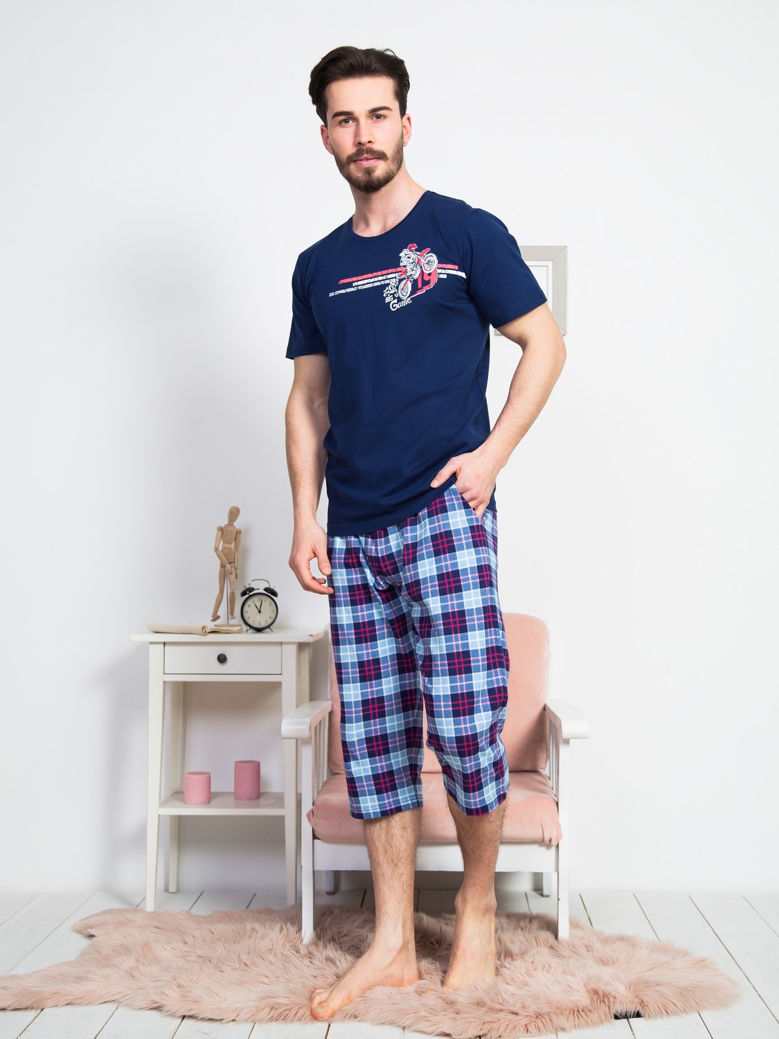 Домашний мужской комплект прямого кроя из чистого хлопка в оливковом и синем цветах. Футболка с короткими рукавами и классической круглой горловиной, декорирована термоаппликация в верхней части груди. Брюки-капри в клетку тартан с карманами на резинке и регулируемой завязке. Качественная турецкая ткань, из которой сшит комплект, – дышащая, легкая, износостойкая и маломнущаяся. Не отжимать, не сдавать в химчистку, стирать при 30 градусах, гладить до 110 градусов, не отбеливать. Произведено в Турции.