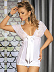 Нежная сорочка с завышенной талией, боковые детали и лиф отделаны кружевом. Широкое декольте выгодно подчеркивает линию груди, а крупный атласный бант акцентирует внимание на ней. Широкие бретели ложатся на предплечья, открывая линию шею и плеч. В комплекте трусики-стринг.